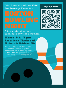 If you are in or near Boston, please join us Saturday, March 7th, for an in-person event! Alumni will join next summer’s leadership team for a fun evening of bowling at American Flatbread Brighton. See below for registration and more information.
